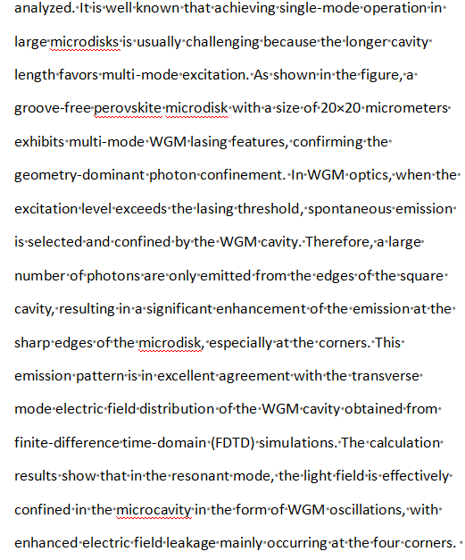 the coupled cavities are highly sensitive to the gap between the two cavities, where the scattering and diffraction effects influenced by the gap spacing play a crucial role in determining the coupling strength. It was found that grooves with widths approximately between 80 and 90 nanometers could achieve effective inter-cavity coupling. Therefore, the observed single-mode laser is attributed to the coupling effect produced by multiple cleaved cavities. FDTD simulation results indicate that the microcavities in the groove regions exhibit a relatively large free spectral range (FSR). Due to this characteristic, single-mode laser emission was observed in these microchips with engineered groove defects. The amplified electric field distributions at the microchip end faces and grooves are shown in the figure. Additionally, compared to the intact structure, the number of laser modes in the grooved microchip was significantly reduced, although single-mode operation was not achieved. This is because the width of the air gap in the coupled cavities plays a key role in determining the laser behavior. The electric field distribution of a perovskite microchip with an embedded groove (width approximately 165 nanometers) is shown in the figure. This larger air gap enhances the outward light scattering while reducing the optical transmission between the terminal microcavities, ultimately lowering their coupling efficiency. based on the above discussion, three fundamental conditions are required to achieve high-performance single-mode lasers in perovskite microchips: i) an optimal number of grooves; ii) a sufficiently narrow air gap to ensure coupling efficiency; iii) an appropriate distribution of groove positions.