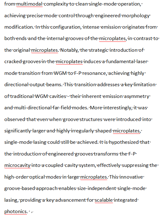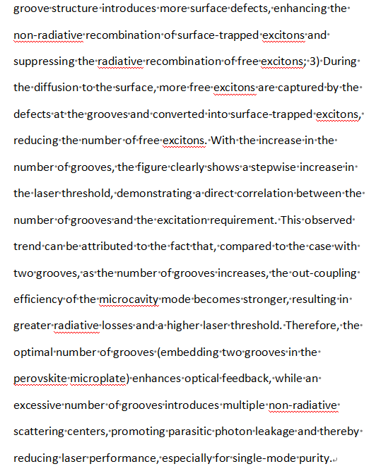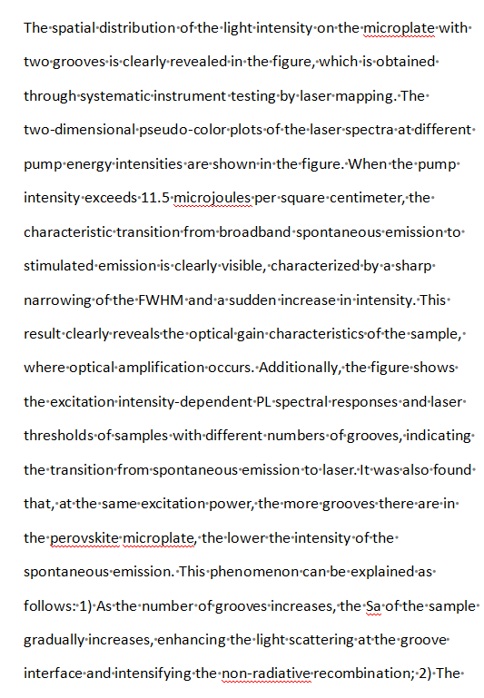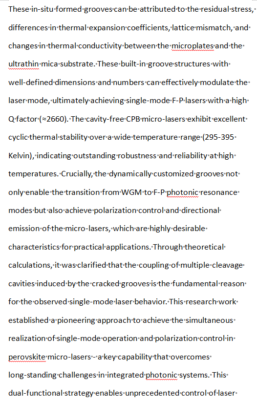 Surprisingly, the strategically embedded groove structures in perovskite microplates can fundamentally manipulate their associated laser characteristics. As shown in the figure, with the increase in the number of grooves, the emission spectrum evolves