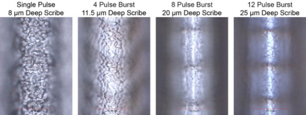 測(cè)試樣品為 340μm 厚的4H-SiC材料。利用這款雷射的可程序設(shè)計(jì)脈沖串功能,我們使用從單脈沖到12個(gè)脈沖串的各種脈沖配置制作了各種劃片。