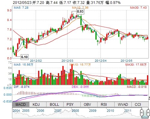今 開(kāi): 7.20 成交量: 317630手 振 幅: 3.72% 最 高: 7.44 成交額: 23312.94萬(wàn) 換手率: 3.36% 最 低: 7.17 總市值: 76.45億 市凈率: 2.57 昨 收: 7.25 流通市...