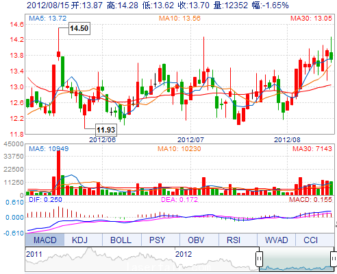 今 開: 13.87 成交量: 12352手 振 幅: 4.74%