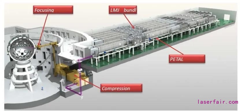 LMJ裝置于法國南部波爾多市的阿基坦科技研究中心破土動工。2008年,開始試運行。之后法國又為LMJ裝置增加了PETAL (ICF PETawatt Aquitaine Laser), 是一路短脈沖(500fs~10ps), 超高功率(1~7PW),高能 (1~3.5kJ) 光束。