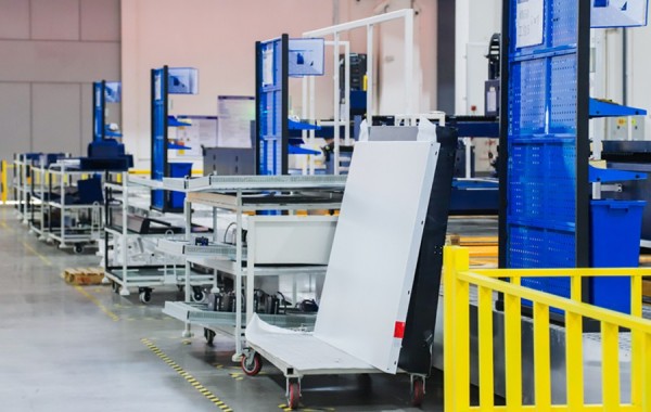 該車間投入500萬用于建設(shè)智能生產(chǎn)流水線,實現(xiàn)激光切割機流水線式生產(chǎn),智能化立體物料倉儲,以及不同生產(chǎn)工序間AGV物料自動運轉(zhuǎn)。