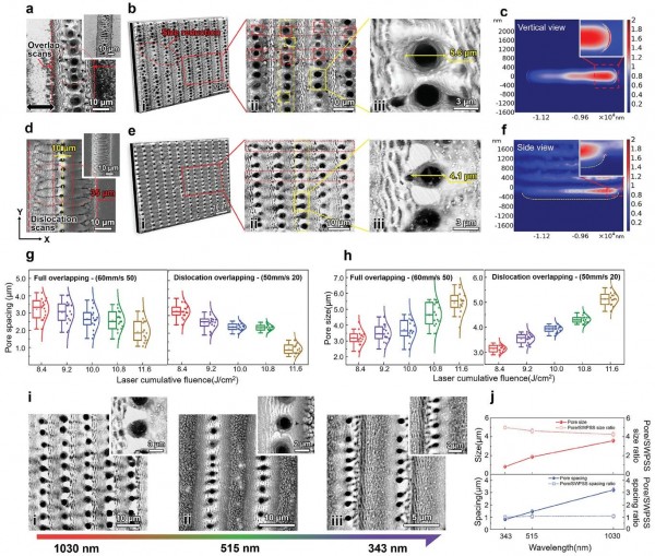 i)343 nm(光斑8 μm, Δy=5 μm)/515 nm(光斑16 μm, Δy=9 μm)/1030 nm(光斑25 μm, Δy=10 μm)激光波長下的微/納米孔形貌