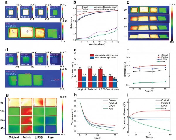 f)表面微/納結(jié)構(gòu)金屬玻璃的紅外熱成像測量。