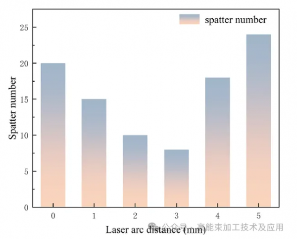 圖5可以得出,飛濺數(shù)量隨DLA增大呈先降后升趨勢:DLA為0-3 mm時,飛濺顯著減少,尤其在2-3 mm區(qū)間達到最低,表明過程穩(wěn)定性最優(yōu);當DLA增至4-5 mm,飛濺數(shù)量再度上升。