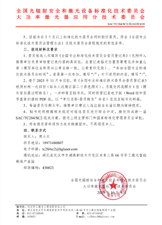 請(qǐng)于2025年11月9日前,將《全國(guó)專業(yè)標(biāo)準(zhǔn)化技術(shù)委員會(huì)委員登記表》(一式四份,貼二寸近照,另附同底照片1張)郵寄至秘書處,同時(shí)將電子版(Word版及簽字蓋章PDF版)發(fā)送至以下郵箱:tc284sc2@hglaser.com。