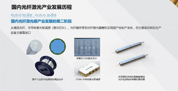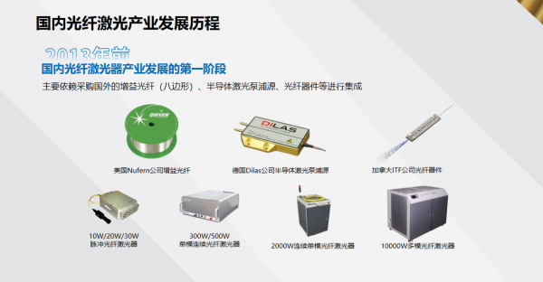 2013年起,國內(nèi)光纖激光器件產(chǎn)業(yè)逐步發(fā)展,增益光纖、半導(dǎo)體激光泵浦源、激光芯片、合束器、隔離器等關(guān)鍵部件陸續(xù)實(shí)現(xiàn)國產(chǎn)化,推動了光纖激光器整機(jī)的量產(chǎn)。在部分功率段的激光單品上,國產(chǎn)激光器開始具備與進(jìn)口產(chǎn)品競爭的能力。不過,這一階段的國產(chǎn)器件仍以仿制為主,生產(chǎn)設(shè)備也多數(shù)依賴進(jìn)口。