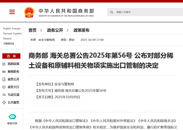 10月9日,商務(wù)部、海關(guān)總署公告2025年第56號公布對部分稀土設(shè)備和原輔料等相關(guān)物項(xiàng)實(shí)施出口管制的決定,其中,實(shí)施出口管制的物項(xiàng)包括用于稀土磁材加工的激光切割設(shè)備。...
