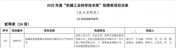在由中國機(jī)械工業(yè)聯(lián)合會(huì)、中國機(jī)械工程學(xué)會(huì)聯(lián)合組織的2025年度“機(jī)械工業(yè)科學(xué)技術(shù)獎(jiǎng)”評(píng)審中,天弘激光作為核心完成單位參與的項(xiàng)目《高端裝備智能激光再制造關(guān)鍵技術(shù)與產(chǎn)業(yè)化應(yīng)用》榮獲二等獎(jiǎng)。