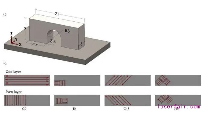 研究人員測試了四種不同的印刷圖案,其中的激光要么連續(xù)地在金屬粉末中來回熔化,要么在不同的方形島中熔化,并且平行于零件的長邊或與零件的對角線延伸。
