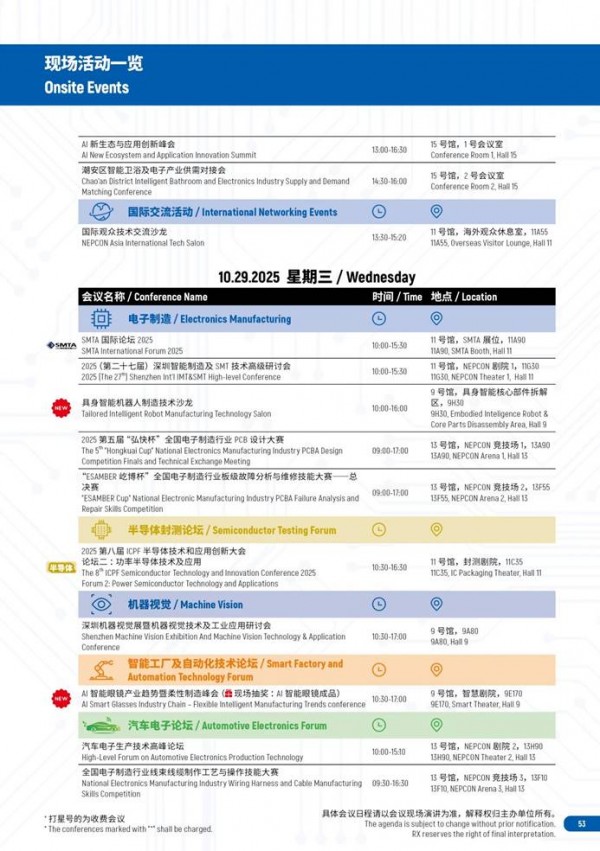 本屆展會(huì)不僅打造具身智能機(jī)器人及核心零部件拆解區(qū)、AI智能眼鏡拆解區(qū)、IGBT & SiC模塊封測(cè)工藝示范線、電子成品自動(dòng)化包裝示范區(qū)、柔性生產(chǎn)制造及智能輸送主題展區(qū)等亮點(diǎn)展區(qū),還有40場(chǎng)會(huì)議活動(dòng)覆蓋七大模塊,助力廣大觀眾一站式看盡電子制造黑科技!