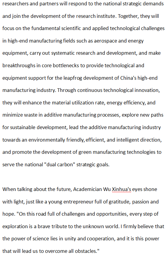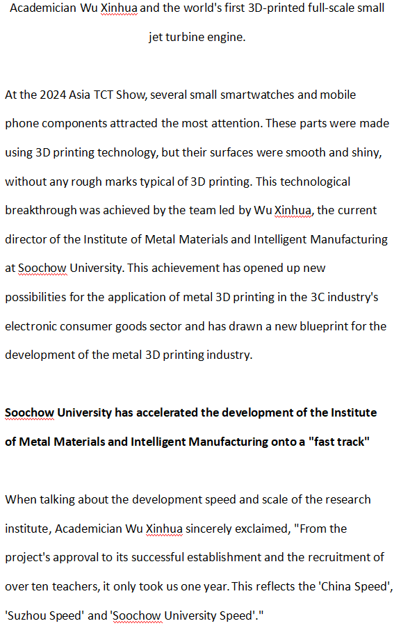 At the invitation of Soochow University, Xinhua Wu, a world-renowned 3D printing expert and academician, has joined the School of Steel Science and Technology at Soochow University as a chair professor and doctoral supervisor on a full-time basis. He has also established the Institute of metal Materials and Intelligent Manufacturing. The institute adheres to the development concept of "science leadership, technological innovation, and achievement transformation" in a trinity, and is committed to the full industrial chain layout from basic research to equipment application, striving to build an international benchmark in the field of metal 3D printing.
