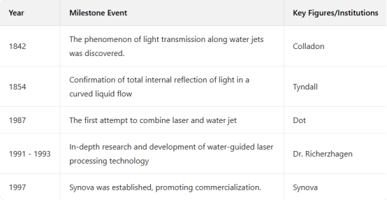 The development of water-guided laser technology can be traced back to the 19th century. In 1842, Colladon discovered that light could be transmitted along a water jet, laying the theoretical foundation for water-guided laser technology. In 1854, Tyndall further confirmed through experiments the phenomenon of total internal reflection of light in a curved liquid flow. However, it was not until the late 20th century that this technology was truly applied to industrial processing. In 1987, Dot first attempted to combine laser and water jet, creating the concept of the "laser knife". In 1991, Dr. Richerzhagen from the Swiss Federal Institute of Technology conducted in-depth research on the principle of water-guided light and successfully developed water-guided laser processing technology in 1993. In 1997, Synova was established and made commercial improvements to the technology, promoting its wide application in precision manufacturing.