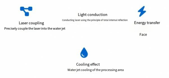 The working principle of water-guided laser technology can be summarized into four steps: laser coupling, light conduction, energy transfer, and cooling effect. Firstly, a high-power pulsed laser beam is precisely coupled into a fine water jet. Then, based on the principle of total internal reflection, the laser stably transmits within the water jet, similar to the conduction process of light in optical fibers. Next, the laser energy is precisely transferred to the work surface through the water flow, achieving precise material processing. Finally, during the processing, the water jet plays a dual role of cooling and confining the laser beam, effectively reducing the heat-affected zone and improving the processing quality.