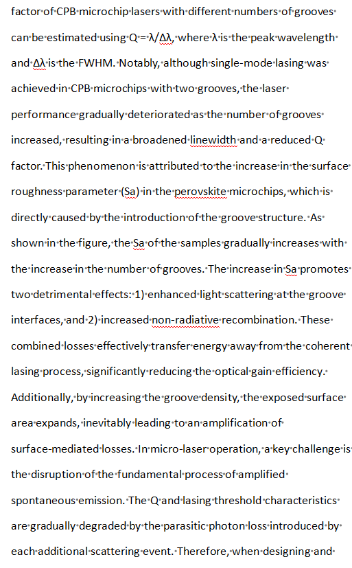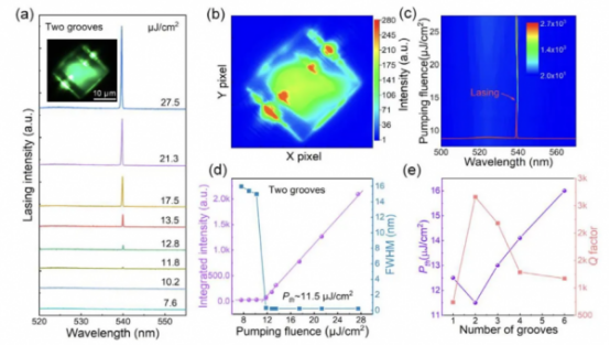 Surprisingly, the strategically embedded groove structures in perovskite microplates can fundamentally manipulate their associated laser characteristics. As shown in the figure, with the increase in the number of grooves, the emission spectrum evolves