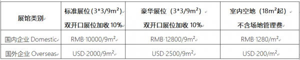 注:標(biāo)準(zhǔn)展位(3m×3m),包括三面圍板、楣板、洽談桌、兩把椅子、垃圾簍、220V/5A電源插座、照明費(fèi)、清潔費(fèi)等??盏夭话ㄈ魏闻涮自O(shè)施,需按規(guī)定向展館繳納施工管理費(fèi)展臺(tái)電源需另行租用。(詳見(jiàn)《參展商手冊(cè)》)