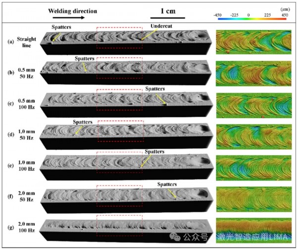 (1) 不同的激光振蕩模式對焊縫表面有明顯的影響。較高的振幅和頻率可以改善表面質(zhì)量,而過大的振蕩參數(shù)可能會增加粗糙度并產(chǎn)生凹形缺陷。
