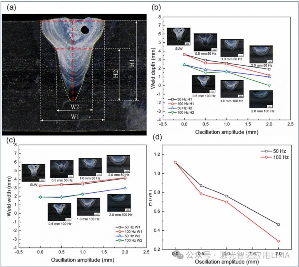 從根本上說,激光焊縫的形狀與激光束的運動有因果關(guān)系。在焊接過程中,振蕩幅度和頻率的改變改變了焊接速度,從而影響了激光的線能量密度和總熱輸入。焊縫截面形貌呈“高腳杯”狀,由兩部分組成,下部為“杯柄”,上部為“杯腹”。熔透深度和“杯桿”分別定義為H1和H2,焊縫(“杯腹”)和“杯桿”寬度分別定義為W1和W2。焊縫寬度W1和W2均隨振蕩幅度的增大而同步增大,焊縫形貌由“高腳杯”形逐漸轉(zhuǎn)變?yōu)椤靶略滦巍毙巍?br/>