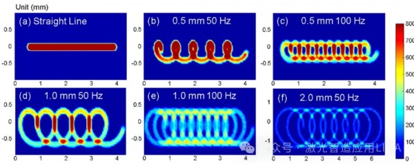 激光能量密度最大出現(xiàn)在軌跡重合處。對比下圖圖(b、d)和圖 (c、e)可知,掃描頻率的增加會增大沿掃描路徑的軌跡重合面積,使激光能量分布更加均勻。然而,最大能量密度的減小會導致焊縫深度的減小。
