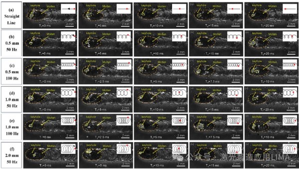 為闡明掃描路徑對熔池行為的影響,采用高速攝像系統(tǒng)對熔池和鎖孔的演變過程進行了觀察。下圖圖(a)示出了直線路徑下熔池的演化過程。圖(b-f)為不同振蕩參數(shù)下熔池的演化圖。隨著振蕩頻率和振幅的增加,熔池后部由于熔池寬度的擴大而變得更加圓潤。隨著熔池長度的增加,鎖孔噴發(fā)引起的表面波動在后向傳播過程中減小。因此,熔化的液態(tài)金屬在熔池后端平滑而有規(guī)律地凝固,形成均勻致密的焊縫魚鱗。