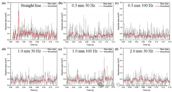 下圖顯示了激光焊接過程中鑰孔開口面積的變化,這是由熔池的高速攝影圖像得出的。如圖(a)所示,在直線焊接過程中,鎖孔開口尺寸表現(xiàn)出明顯的波動。觀察到幾個鎖孔關(guān)閉(0 mm2)的實例,平均鎖孔開放面積為0.47 mm2。振蕩幅度的增加還可以減少波動,提高穩(wěn)定性。這是因為振蕩焊接中能量分配到兩側(cè)的比例較大。因此,鎖孔上的出口膨脹,振蕩幅度增大,從而增加了開口面積。振幅的增加擴大了激光束的攪拌范圍,導致鎖孔周期運動半徑的擴大。由于熔融金屬的粘性和作用于鎖孔壁附近的流體動壓力,在靠近鎖孔開口的焊接熔池內(nèi)發(fā)生渦流運動。鑰匙孔開放面積的擴大加強了其穩(wěn)定性,避免了氣泡的形成,從而顯著抑制了孔隙率。