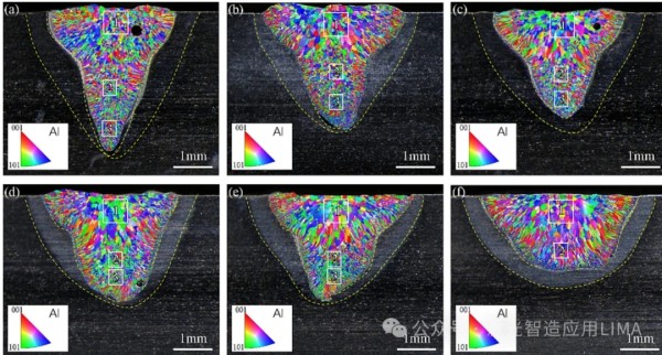 下圖顯示了不同振蕩頻率和振幅下焊縫截面的EBSD形貌。在激光焊縫熔合線附近,柱狀枝晶晶粒向焊縫中心生長。如圖(a)所示,在“杯腹”和“杯莖”區(qū)域之間,可以觀察到明顯的柱狀顆粒分布差異。柱狀晶粒沿“杯腹”壁呈u型分布,而在“杯莖”區(qū),柱狀晶粒沿熔合線呈u型分布。在焊縫凝固過程中,熔合區(qū)部分凝固的晶粒作為凝固前沿進行形核,并優(yōu)先沿最大溫度梯度方向垂直于熔池邊界生長。這種現(xiàn)象的發(fā)生是由于激光的高功率密度,導致焊接池內(nèi)部過熱。較高的熱梯度G和中等的生長速率R使得G/R大于組織轉(zhuǎn)變的閾值,導致柱狀晶粒的形成。焊縫中心溫度梯度G減小,導致G/R比逐漸降至組織轉(zhuǎn)變閾值以下,向等軸晶過渡。等軸晶粒均位于“杯腹”和“杯莖”的中心部位。由于焊縫的“杯莖”較窄且靠近基體,因此在冷卻過程中,在“杯腹”區(qū)域之前完全凝固。凝固后的“杯莖”部分作為“杯腹”底部的成核部位,促進柱狀晶粒向上生長。