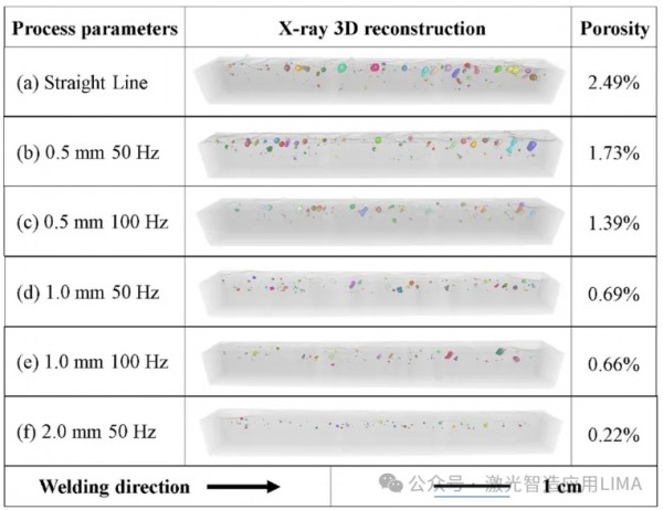 三維x射線斷層掃描對焊縫進行了全面檢查,獲得了焊縫內(nèi)氣孔的三維分布,如下圖所示??紫堵实挠嬎惴椒闅饪椎目傮w積除以焊縫的總體積。通過對直線激光振蕩焊和圓形激光振蕩焊焊縫孔隙形態(tài)和分布的比較,發(fā)現(xiàn)直線激光振蕩焊焊縫中含有較多的大體積孔隙,孔隙率為2.49%,顯著高于圓形激光振蕩焊焊縫。通過圖(b、c)和圖(d、e)的對比可以看出,增加振蕩頻率有助于抑制孔隙的形成。對比圖(b、d)和圖(c、e)可以看出,振蕩幅度的增大對孔隙形成的抑制也有很大作用。當振蕩幅度進一步增大到2mm時(圖(f)),孔隙率進一步降低到0.22%,只剩下小體積和小孔隙。