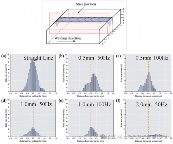 下圖描繪了距焊縫中心線不同距離處的孔隙面積分布,表示了基于孔隙面積大小的孔隙率。對于直線焊接,氣孔面積沿焊縫中心線呈對稱分布,隨著離焊縫中心線距離的增加,氣孔面積逐漸減小。結(jié)果表明,鎖孔誘發(fā)的氣孔主要集中在焊縫中心線熔池后壁后方。對于激光振蕩焊接,孔分布的對稱性變?nèi)酢?br/>