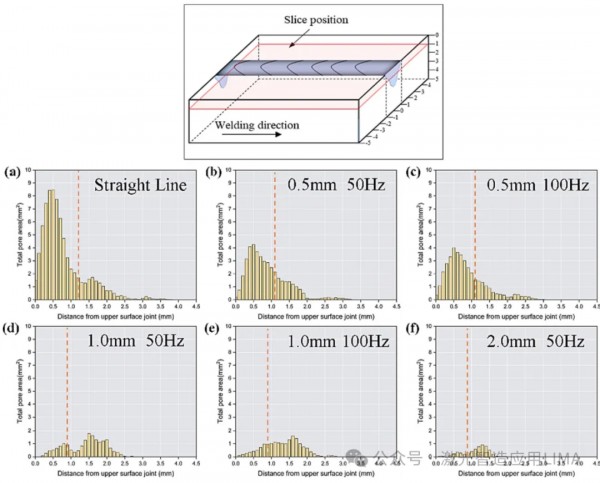 下圖顯示了距離焊縫表面不同距離處的孔隙面積,其中紅線表示“杯腹”和“杯干”區(qū)域的邊界。在大孔隙占主導地位的情況下(圖(a-c)),邊界以上的孔隙面積占85%以上。這是因為縱向邊界處的輪廓過渡更容易捕獲焊縫池中的氣泡,并且捕獲的氣泡在浮力的影響下有向上遷移的趨勢。在以小孔隙為主的情況下(圖(d-f)),孔隙集中在邊界線以下0.5 mm范圍內(nèi)的區(qū)域內(nèi)。冷卻時間短,向上位移小可能是造成這種現(xiàn)象的原因。