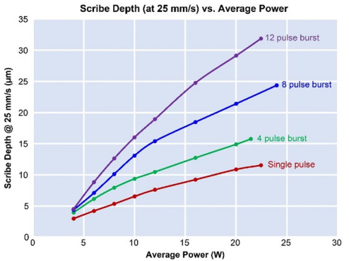 圖 1. 單脈沖和各種脈沖串配置(4-12 個(gè)脈沖串子脈沖)在 25 mm/s 凈速度下的劃線深度與功率的函數(shù)關(guān)系。顯然,脈沖串提高了燒蝕率。