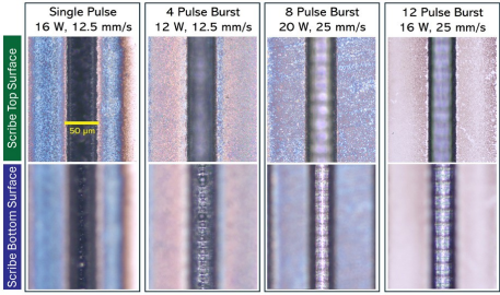 在上排照片中,顯微鏡聚焦的是晶圓上表面,而在下排照片中,聚焦的是劃線底面(底部)。隨著脈沖串子脈沖數(shù)的增加,整體特征質(zhì)量明顯提高。