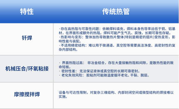 傳統(tǒng)散熱片制造技術(shù)主要采用:釬焊、機械壓合/環(huán)氧粘接及攪拌摩擦焊接等連接技術(shù),傳統(tǒng)方法在界面熱阻、結(jié)構(gòu)精度、密封可靠性和復雜幾何形狀適應性上無法滿足新一代散熱器的需求,激光焊接工藝以其獨特優(yōu)勢逐漸成為散熱片連接主流技術(shù)。