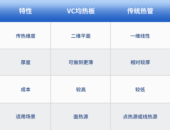 傳統(tǒng)熱管的導熱率大概是5000-10000W/m·K,而VC均熱板導熱率大概是10000-20000W/m·K,是熱管散熱效率的兩倍,甚至更高;熱管可以看作是一維的點對點的傳熱,而VC均熱板就相當于是二維的面對面散熱,所以散熱面積更廣,單位時間內(nèi)能帶走的熱量更多,重點是可以兼容處于不同高度的多個熱源的散熱。