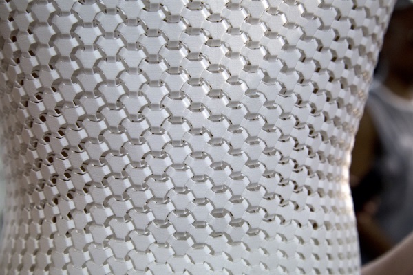 Bradley設(shè)計(jì)的蜂窩結(jié)構(gòu)使得打印出來(lái)的互鎖模式變得更加柔軟和舒適。蜂窩結(jié)構(gòu)的一個(gè)非常獨(dú)特的功能是它能夠改變整個(gè)服裝的織物屬性。每個(gè)部分的柔性可以是不同的,只需通過(guò)增厚或變薄各個(gè)獨(dú)立的蜂窩單元就能實(shí)現(xiàn)此目的。