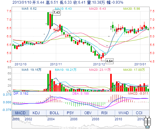 | 今 開: | 6.44 | 成交量: | 10.38萬手 | 振 幅: | 2.78% |