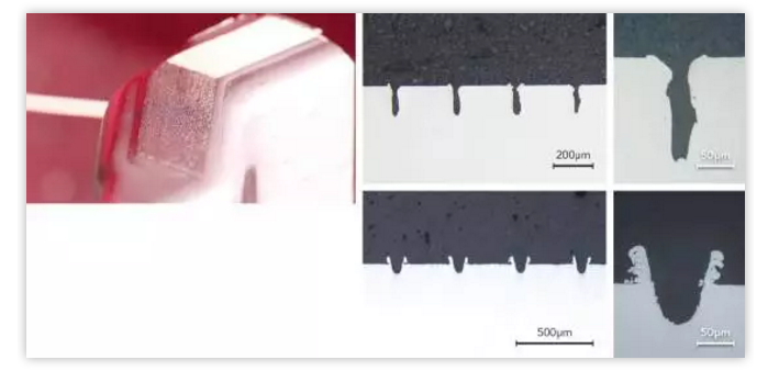 圖1 示出了兩種不同的凹槽幾何形狀:頂部是使用連續(xù)波(CW)單模光纖激光器打造的樣式,其特征是頂部帶有小的重鑄結(jié)構(gòu)的不規(guī)則橫截面凹槽,而底部是采用一款納秒脈沖激光器打造的樣式,特征是在頂部具有大的重鑄結(jié)構(gòu)的規(guī)則凹槽形狀。