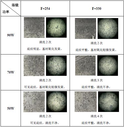 (1)場鏡F=254下清洗條紋較場鏡F=330明顯,這是由于場鏡F=254焦點大小為0.085mm,小于設定填充間隙0.1mm造成的;