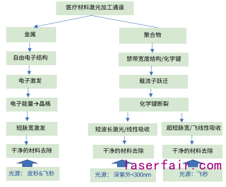 主要的醫(yī)療器件的材料有兩大類:金屬和聚合物。根據(jù)激光與材料作用的機理來考慮,這兩種材料由于電子能帶結(jié)構(gòu)完全不相同,所以加工主要通道是不同的。與材料直接接觸的機械加工不同,激光加工需要把光子能量耦合到材料晶格通過熱解離或者光解離實現(xiàn)材料的去除。通過控制這個加工的通道,實現(xiàn)對加工質(zhì)量的控制。一般在激光加工領(lǐng)域內(nèi),通常接受一個解釋:低質(zhì)量的“熱加工”和高質(zhì)量的“冷加工”。