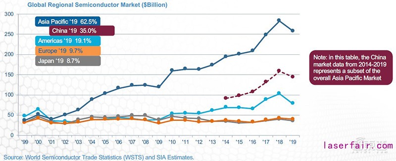 在市場方面,隨著2001年電子設(shè)備生產(chǎn)轉(zhuǎn)移至亞太地區(qū),亞太市場逐漸成為全球最大半導(dǎo)體市場,規(guī)模從不到400億美元增至2019年的2580億美元,其中中國占亞太地區(qū)市場的56%,占全球總市場的35%,已成全球芯片公司必爭之地。