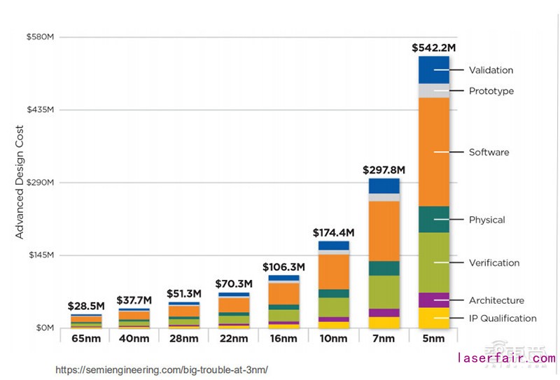 比如28nm制程的芯片設(shè)計成本約為5130萬美元,到5nm節(jié)點時,成本已飆至逾5億美元。