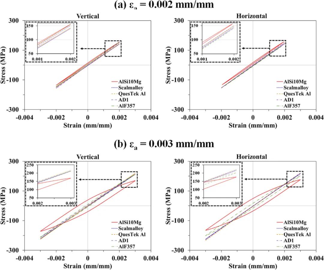 這是因?yàn)?.002處的應(yīng)力響應(yīng)mm/mm應(yīng)變振幅遠(yuǎn)低于表4中列出Scalmalloy、QuesTek Al、AD1和AlF357的屈服強(qiáng)度。然而,AlSi10Mg在該應(yīng)變振幅水平下的應(yīng)力響應(yīng)(即0.002mm/mm)接近其屈服強(qiáng)度(見表4),導(dǎo)致輕微塑性變形。