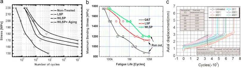 綜上所述,激光誘導(dǎo)殘余壓應(yīng)力的大小和深度,以及殘余壓應(yīng)力的穩(wěn)定性對金屬材料的疲勞性能的決定起著至關(guān)重要的作用。圖4為WLSP后的疲勞壽命延長情況。與LSP相比,經(jīng)過100萬次加載循環(huán)后,WLSP可以進一步提高AA6061的疲勞強度,從180 MPa提高到200 MPa(圖4a)。對鋁合金而言,高周區(qū)疲勞性能的改善比低周區(qū)更為顯著。對于碳鋼4140,從圖4b的應(yīng)力-壽命(S-N)曲線可以看出,WLSP試樣(1200 MPa)的疲勞極限比LSP試樣(1125 MPa)大75 MPa。對于Ti6Al4V鈦合金,如圖4c所示,在100-300℃時,WLSP試樣的疲勞性能要優(yōu)于室溫LSP試樣,但當(dāng)WLSP處理溫度達到400℃時,出現(xiàn)了明顯的疲勞壽命劣化現(xiàn)象。
