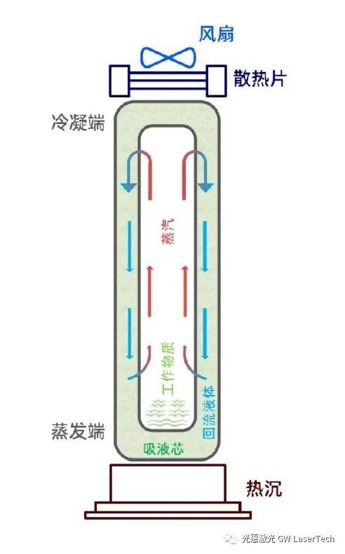 熱管散熱器散熱是指熱管依靠自身內(nèi)部的工作液體相變來實(shí)現(xiàn)傳熱,這種液體沸點(diǎn)低,容易揮發(fā)。熱管一端為蒸發(fā)端,連接激光器內(nèi)部的熱沉;另外一端為冷凝端,連接外部的散熱片與風(fēng)扇。管壁有吸液芯,由毛細(xì)多孔材料構(gòu)成。當(dāng)激光器發(fā)熱時(shí),蒸發(fā)端受熱,工作液體迅速蒸發(fā),蒸汽在壓力差下流向冷凝端,并且釋放出熱量,通過風(fēng)扇排出;同時(shí),蒸汽重新凝結(jié)成液體,液體通過吸液芯再流回蒸發(fā)段(若是重力熱管,則沒有吸液芯,液體附著在管壁上依靠重力流回底部蒸發(fā)段)。如此循環(huán)不止,便實(shí)現(xiàn)了熱量從激光器內(nèi)部轉(zhuǎn)移到外部。