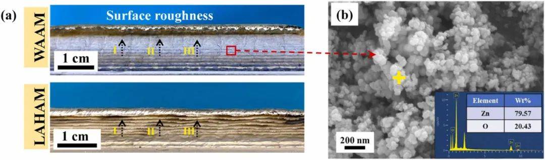 表3顯示了通過WAAM和LAHAM制造的Al-Zn-Mg-Cu合金試樣的化學(xué)成分。給出的元素含量是三個(gè)試樣的平均值。結(jié)果表明,沉積試樣的鋅含量低于金屬絲的鋅含量。白色松散粉末粘附在WAAM試樣的XOZ平面表面,而LAHAM試樣的表面更亮(圖3a)。根據(jù)能量色散光譜儀(EDS)分析,粉末被確定為ZnO,如圖3b所示。鋅的沸點(diǎn)是1180?K、遠(yuǎn)低于Al(2743?K)。因此,鋅會(huì)顯著蒸發(fā),導(dǎo)致其在增材制造過程中含量較低。在高溫條件下,鋅的損失是不可避免的,這是通過焊接和增材制造Al-Zn-Mg-Cu合金的一個(gè)眾所周知的挑戰(zhàn)。Lin等人也通過WAAM在7055鋁合金中觀察到了同樣的現(xiàn)象。如圖3a所示,在沉積樣品的三個(gè)隨機(jī)位置進(jìn)行三次不同的測(cè)量,每個(gè)樣品總共進(jìn)行9次測(cè)量。LAHAM樣本的Rz值為20.9?±?2.3,而WAAM試樣的值為27.3?±?分別為1.3。因此,WAAM和LAHAM過程可以被認(rèn)為是穩(wěn)定的。