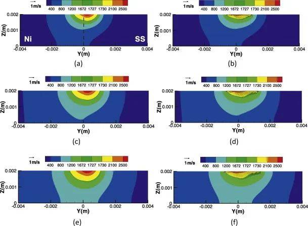 圖3(a–f)顯示了兩種情況下在加熱期間不同時(shí)間計(jì)算的溫度場和速度場的比較。圖中的輪廓值表示以Kelvin為單位的溫度。黃色和紅色部分代表液體區(qū)域。可以看出,在這兩種情況下,遠(yuǎn)離熔池的溫度場在不同時(shí)間是相似的,這表明了在傳統(tǒng)焊接力學(xué)中忽略流體流動和質(zhì)量傳輸?shù)囊恍┖侠硇?。然而,對于靠近熱源的區(qū)域,情況卻截然不同。對于情況1,熔合區(qū)更深、更窄,并且具有半球形,這是由于能量僅通過熱傳導(dǎo)從激光束中心徑向傳輸而產(chǎn)生的。峰值溫度總是在304不銹鋼一側(cè),因?yàn)槠鋵?dǎo)熱系數(shù)遠(yuǎn)低于鎳。對于情況2,當(dāng)考慮流體流動和質(zhì)量傳輸時(shí),由于最大熱輸入通量,峰值溫度向激光束中心移動。當(dāng)表面張力的溫度系數(shù)為負(fù)值時(shí),流體從激光束的中心(表面張力變?。┝飨蛉鄢氐耐鈬鰪?qiáng)了從熱零件到冷零件的能量傳輸。因此,情況2的峰值溫度遠(yuǎn)低于情況1(2423 K vs 3058 K),并且在加熱期間,熔池中的溫度梯度較小。圖4(a–d)顯示了兩種情況在冷卻循環(huán)期間計(jì)算的溫度場和速度場的比較。在激光器關(guān)閉后,情況2的熔池僅保持液態(tài)30 ms,而情況1的時(shí)間要長得多(約140 ms)。
