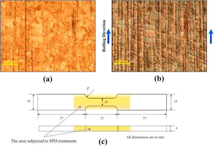 根據(jù)ASTM E466標(biāo)準(zhǔn)制備疲勞試樣,以研究AR和處理材料的軸向疲勞行為。圖2a顯示了通過體視學(xué)方法確定的平均晶粒尺寸約為40μm的AR材料的微觀結(jié)構(gòu)。使用圖2b中的Nomarski對比,可以觀察到由軋制引起的溶質(zhì)帶狀線。疲勞試樣的尺寸和應(yīng)用表面處理的考慮區(qū)域如圖2c所示。所選中心區(qū)域的所有四個側(cè)面都進(jìn)行了噴丸處理。
