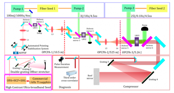 基于啁啾脈沖放大(CPA)技術(shù),超強(qiáng)超短激光裝置的峰值功率在過(guò)去數(shù)十年間已經(jīng)從太瓦提高到了10拍瓦(1 PW=1015W)量級(jí),并逐步走向重復(fù)頻率工作模式。目前,100 PW量級(jí)激光裝置的建設(shè)及其前沿應(yīng)用也成為了當(dāng)前的國(guó)際研究熱點(diǎn)。然而面向更高峰值功率激光,現(xiàn)有的CPA技術(shù)進(jìn)一步發(fā)展受到鈦寶石晶體口徑以及固有橫向寄生激光效應(yīng)等的限制。相比之下,基于大口徑非線(xiàn)性晶體的光學(xué)參量啁啾脈沖放大(OPCPA)將成為實(shí)現(xiàn)100 PW峰值功率激光最可行技術(shù)方案之一。