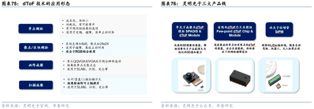 聚焦單光子探測器賽道,dToF技術(shù)優(yōu)勢明顯。靈明光子創(chuàng)立于2018年,致力于單光子探測器(SPAD)賽道,為手機(jī)、激光雷達(dá)、機(jī)器人、無人機(jī)、VR/AR設(shè)備等應(yīng)用提供自主研發(fā)的高性能dToF深度傳感器芯片。dToF(direct time-of-flight,直接測量飛行時間)直接向測量物體發(fā)射光脈沖,測量反射光脈沖和發(fā)射光脈沖之間的時間間隔來計(jì)算待測物體的距離。dToF可以單點(diǎn)測距,也可以配合掃描或光學(xué)鏡頭進(jìn)行成像,為未來元宇宙中物理世界和數(shù)字信息世界的實(shí)時交互填補(bǔ)3D智慧感知拼圖。
