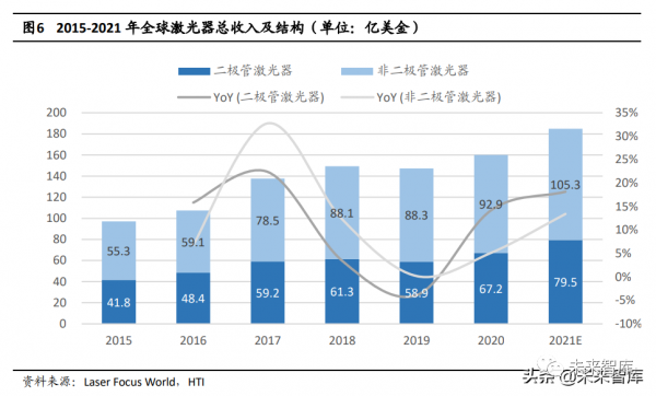 從應(yīng)用領(lǐng)域來看,根據(jù)《2021 年中國激光產(chǎn)業(yè)發(fā)展報(bào)告》,2020 年全球激光器銷售額 為 160.1 億美元。結(jié)構(gòu)上來看,材料加工與光刻、通訊與光存儲、科研和軍事、醫(yī)療 和美容、儀器與傳感器及娛樂、顯示與打印占比分別為 39.6%、24.5%、13.8%、 5.7%、12.6%及 3.8%。據(jù)報(bào)告預(yù)測,2021 年全球激光器的總市場規(guī)模為 185 億美金, 市場增長率為 15%,其中半導(dǎo)體激光器(作為固體激光器和光纖激光器等其他激光器 的核心泵浦光源或作為直接激光器),其市場規(guī)模預(yù)計(jì)為 79.5 億美金(占比 43%),市 場增速為 18%。我國激光器行業(yè)發(fā)展迅速、競爭優(yōu)勢明顯,在全球激光器市場中所占的比重也持續(xù)提 升,根據(jù) Laser Focus World 發(fā)布的數(shù)據(jù),2020 年,我國激光器市場規(guī)模為 109.1 億美 元,占全球激光器市場 66.12%的份額。